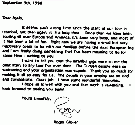 1998 ISTANBUL " Konseri sonrasi ROGER GLOVER in Majorun sahibi EYUP e yazdigi