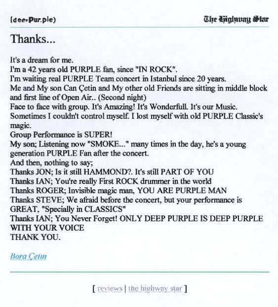 Eğer 1998 Turne yorumlarını okursanız, Istanbul konserlerinin, Deep Purple'ın en iyi performanslarından olduğu konusunda genel fikirbirliğini göreceksiniz.